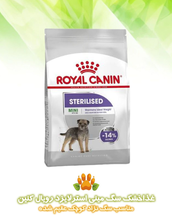 غذای Royal Canin Mini Sterilised مخصوص سگهای نژاد کوچک (وزن ۱ تا ۱۰ کیلوگرم) طراحی شده که بعد از عقیمسازی دچار افزایش وزن نشوند، در عین حال انرژی کافی و طعم عالی داشته باشند.